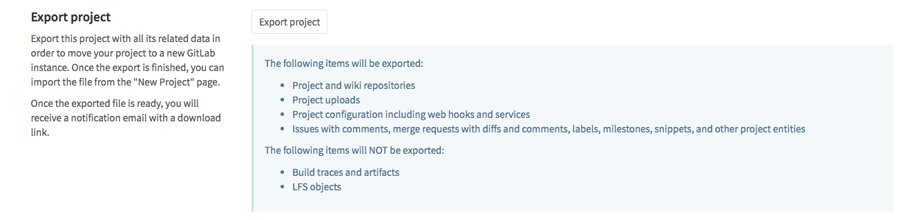 Existing projects running on any GitLab instance or GitLab.com can be exported with all their related data and be moved into a new GitLab instance.